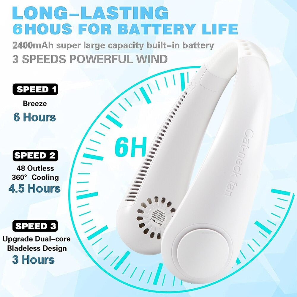 - Safety & 78 Air Outlets: A novel neck fan that can send the wind without waving your hands by simply placing it on your neck. Designed without wings, it can be used safely by children and the elderly. With 78 air outlets around the neck, it can be used for the entire face around, which products enough air to keep you cool always. It is also ideal as a companion for working in hot weather.